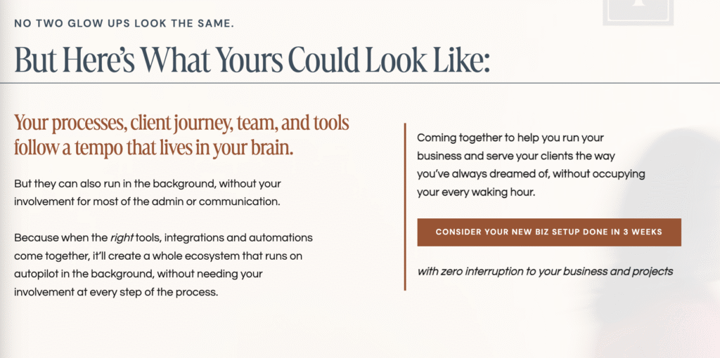 I feel like the copy on the Systems Sprint page really helps guide people to know that, “Okay I need more.” Whereas before, I felt like it was more of a, “I can’t afford the Glow-up so I’ll just go with the Sprint.” So I feel like the copy has really taken people through that journey.“