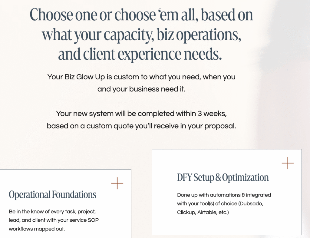 But after conducting market research calls for her (interviewing her past clients and their painpoints), we came to understand that client experience isn’t seen as a “sexy” business investment because of the nature of the solo service business owner who’s busy doing everything themselves.