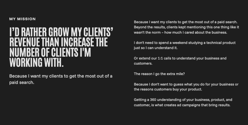 Which is why the sections calling out her clients’ “struggle” and “painpoints” didn’t revolve around that.