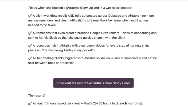 Case studies featuring your clients’ real words from a 1:1 call — the kind that’ll handle all kinds of sales objections — from pricing, trust, and the need to invest today (not a reply that ends with “I’ll get back to you”).